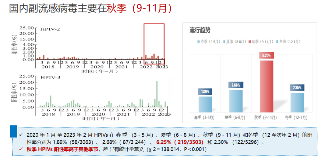 2020年1月至2023年2月HPIVs在春季(3-5月)、夏季(6-8月)、秋季(9-11月)和冬季(12至次年2月)的陽(yáng)性率分別為1.89%、2.68%、6.25%和2.30% 。顯然秋季HPIVs陽(yáng)性率高于其他季節(jié),北京CDC的35家哨點(diǎn)醫(yī)院數(shù)據(jù)顯示:疾病監(jiān)測(cè)2022年之后HPIV-1的陽(yáng)性率大幅降低,HPIV-2陽(yáng)性率明顯升高。無(wú)獨(dú)有偶,美國(guó)CDC監(jiān)測(cè)數(shù)據(jù)顯示HPIV數(shù)量也有明顯增加4。