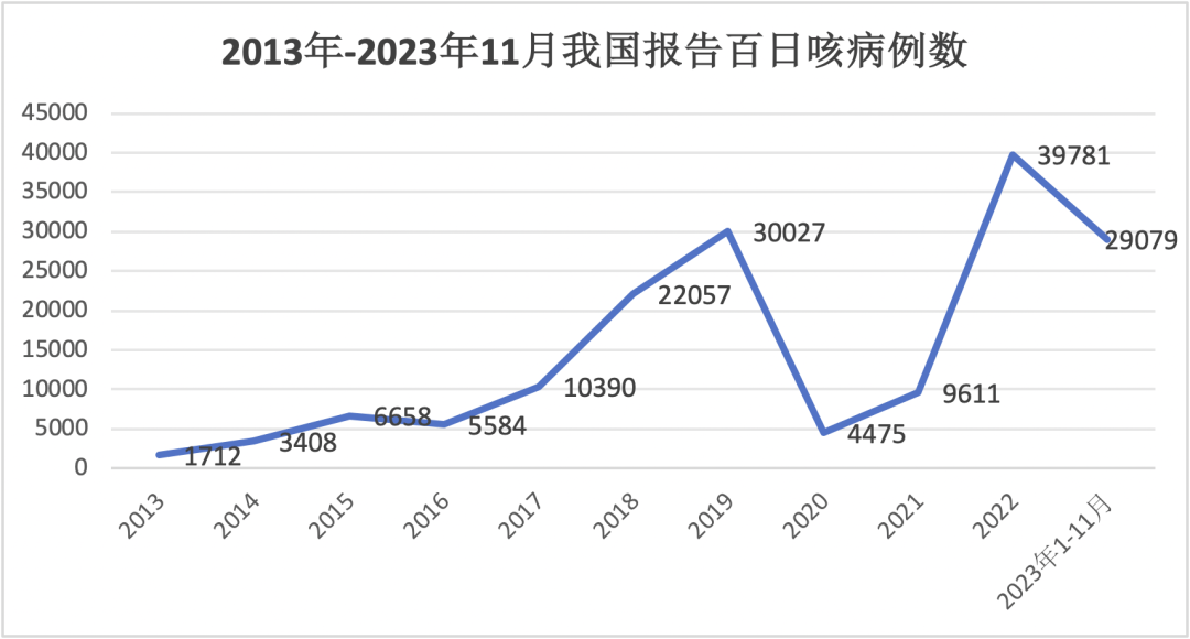 圖片丨來源于《2013年-2023年11月我國報告百日咳病例數(shù)》、