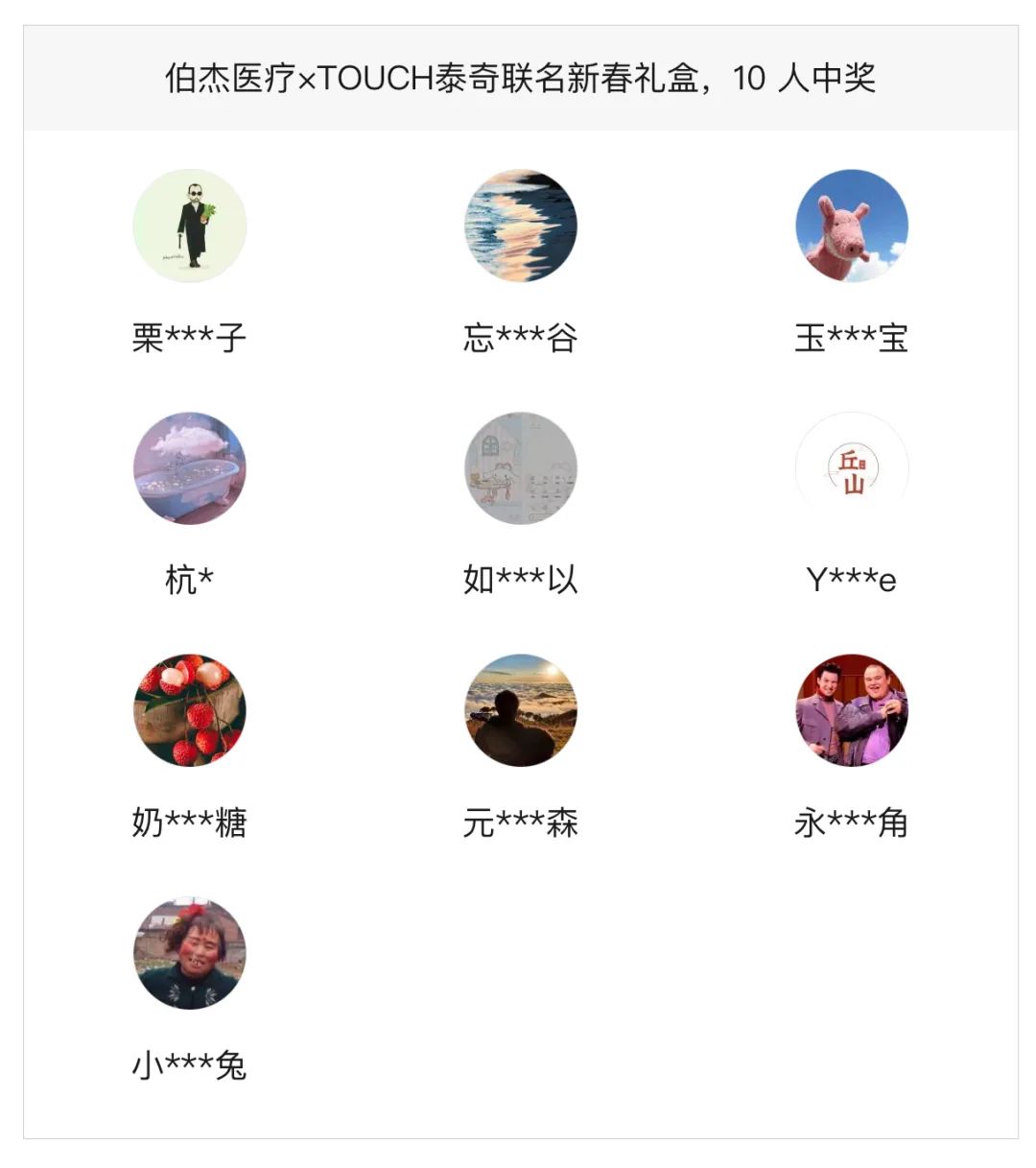 恭喜以上粉絲獲得【伯杰醫(yī)療xTOUCH泰奇】聯(lián)名新春禮盒一份,禮品將于五個工作日內(nèi)安排寄出,請各位耐心等待。