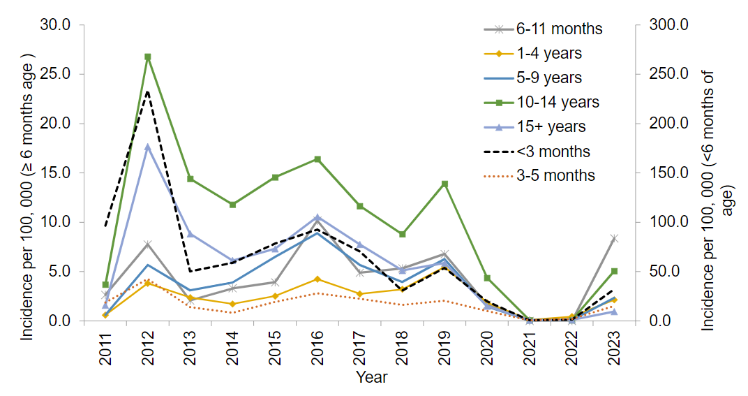 圖2.2011年至2023年英格蘭實驗室確診百日咳病例按年齡組劃分的年發(fā)病率(注1)