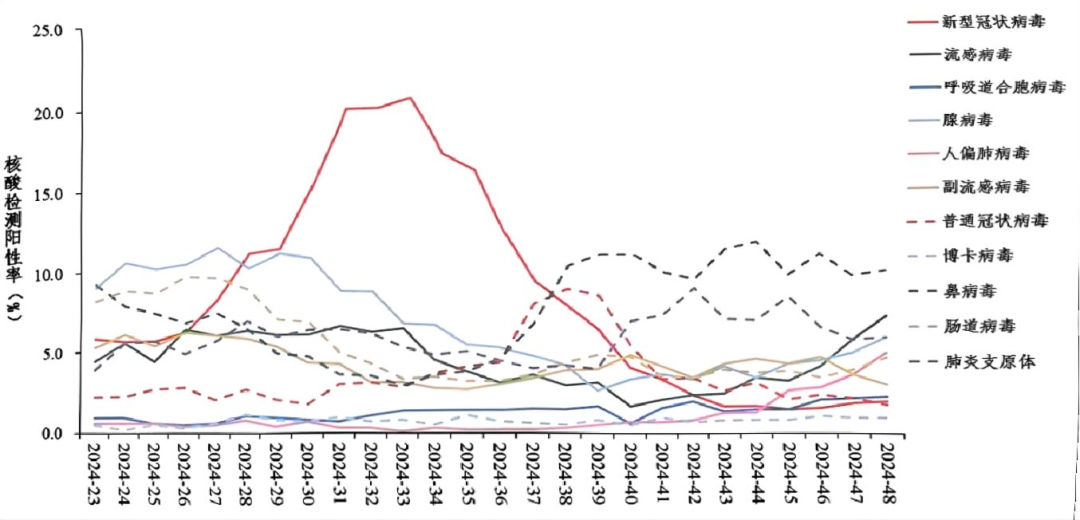 圖2:哨點醫(yī)院住院嚴重急性呼吸道感染病例呼吸道樣本病原體核酸檢測陽性率每周變化趨勢