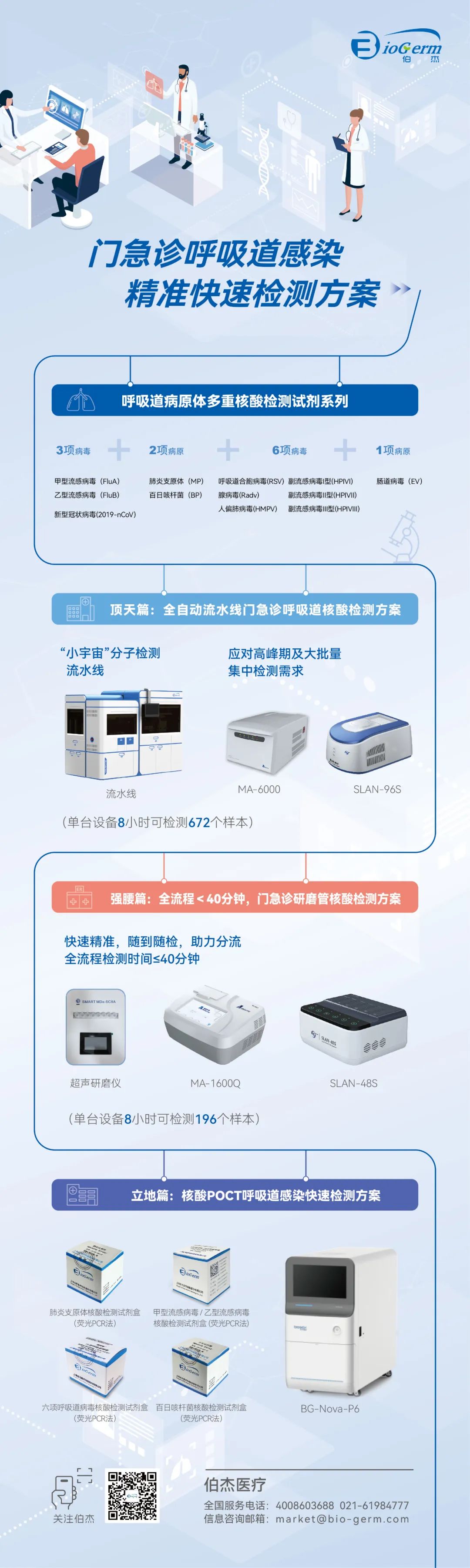 上海伯杰醫(yī)療呼吸道六項病毒檢測試劑盒,獲本市生物制藥“新優(yōu)藥械”產(chǎn)品目錄,能夠同時檢測HMPV和RSV病毒,還包含腺病毒(ADV)、副流感病毒(PIVⅠ、Ⅱ、Ⅲ型)。覆蓋CDC監(jiān)測的重要致病原,40min快速出報告。此外上海伯杰醫(yī)療有呼吸道感染全場景快速檢測解決方案,使用快速多重PCR精準診斷可減少住院時間0.82天3。