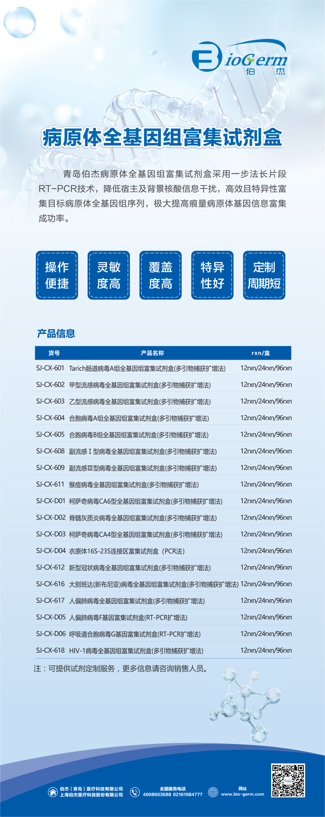 青島伯杰提供含核酸提取、病原體全基因組富集、文庫構(gòu)建以及病原體數(shù)據(jù)分析等在內(nèi)的病原體基因組學(xué)檢測全流程解決方案,可以從臨床感染樣本、病毒培養(yǎng)物、致病性細(xì)菌/真菌培養(yǎng)物等樣本中富集出病原體全基因組序列并構(gòu)建高質(zhì)量文庫,依托不同測序平臺,獲得特異性高、準(zhǔn)確性好的病原體全基因組信息,用于目標(biāo)病原體的基因組信息分析和相關(guān)傳染病監(jiān)測預(yù)警。