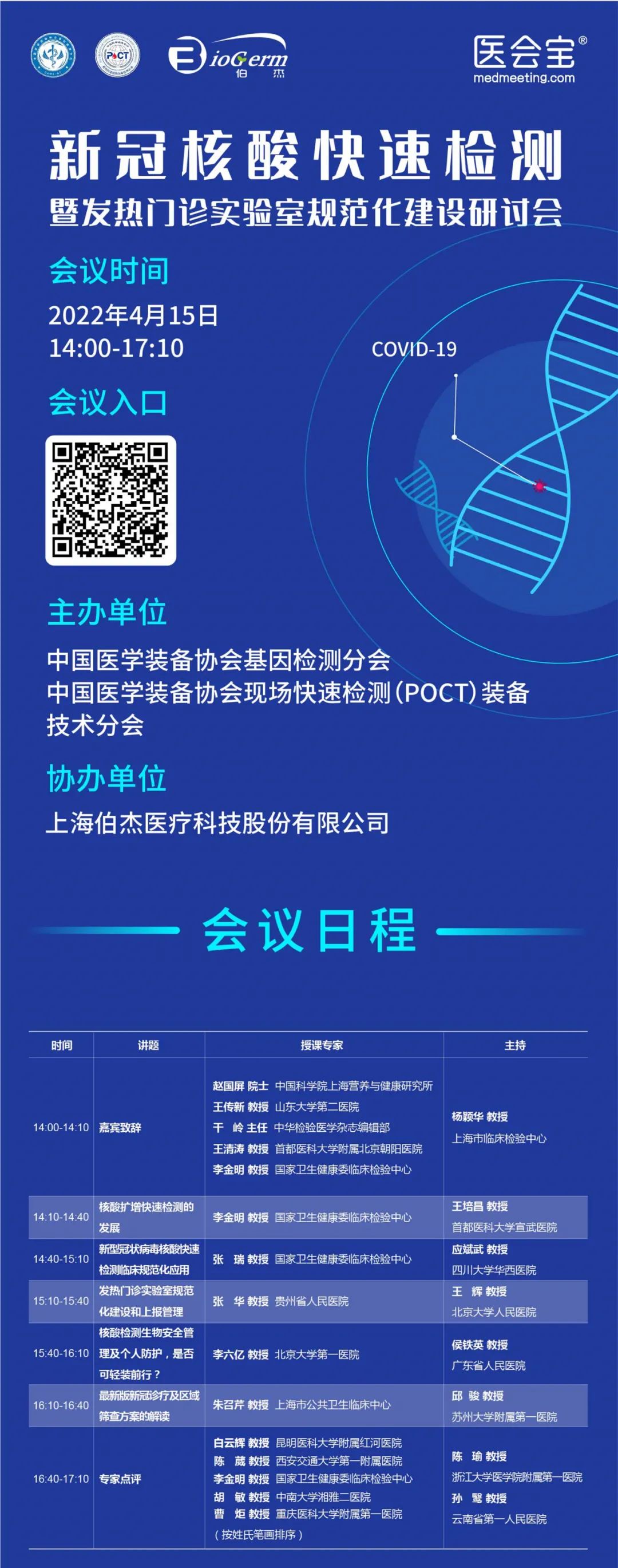 為進一步做好新冠肺炎疫情常態(tài)化精準防控工作,規(guī)范新型冠狀病毒核酸快速檢測的臨床應用,由中國醫(yī)學裝備協(xié)會基因檢測分會、中國醫(yī)學裝備協(xié)會現(xiàn)場快速檢測(POCT)裝備技術分會主辦,上海伯杰醫(yī)療科技股份有限公司協(xié)辦的“新冠核酸快速檢測暨發(fā)熱門診實驗室規(guī)范化建設研討會”于2022年4月15日下午14:00在線上成功舉辦。