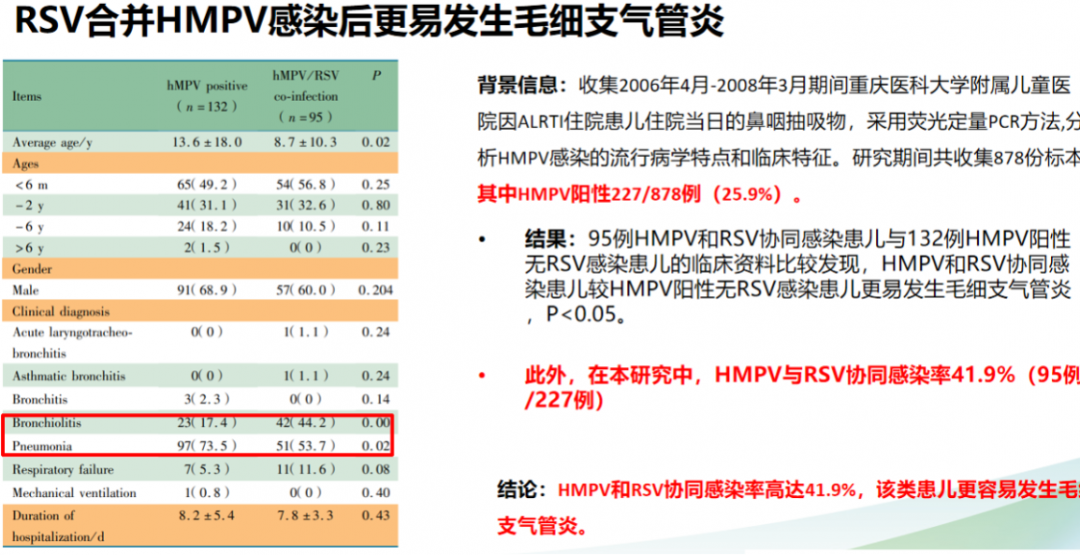 國內(nèi)研究表明:HMPV和RSV協(xié)同感染率高達(dá)41.9%,該類患兒更容易發(fā)生毛細(xì)支氣管炎,機(jī)械通氣的風(fēng)險更高。
