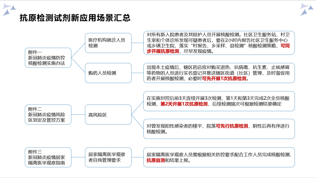 2022年11月,為全力做好新型冠狀病毒肺炎疫情防控工作,根據《新型冠狀病毒肺炎防控方案(第九版)》《關于進一步優(yōu)化新冠肺炎疫情防控措施科學精準做好防控工作的通知》有關要求,國家衛(wèi)健委發(fā)布通知公告,關于印發(fā)《新冠肺炎疫情防控核酸檢測實施辦法》等4個文件的重要通知,其中多處提及了抗原檢測的新應用場景。