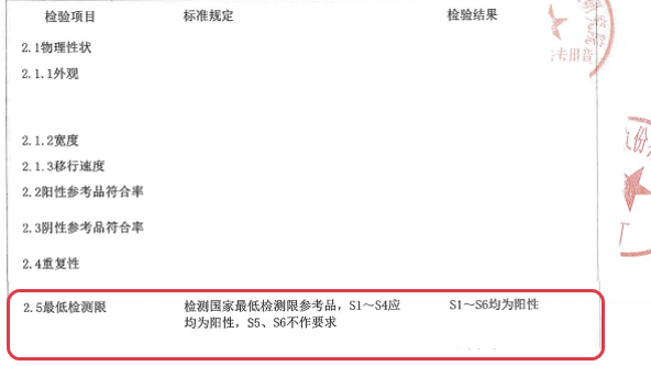 新型冠狀病毒抗原檢測試劑國家最低檢測限參考品S梯度稀釋得到S1-S6,S6為原液1600倍稀釋。國家最低檢測限參考品規(guī)定S1-S4應為陽性,S5,S6不做要求。伯杰醫(yī)療新冠抗原檢測試劑靈敏度高,S1-S6檢出均為陽性,性能符合國家規(guī)定,并高于國家規(guī)定。