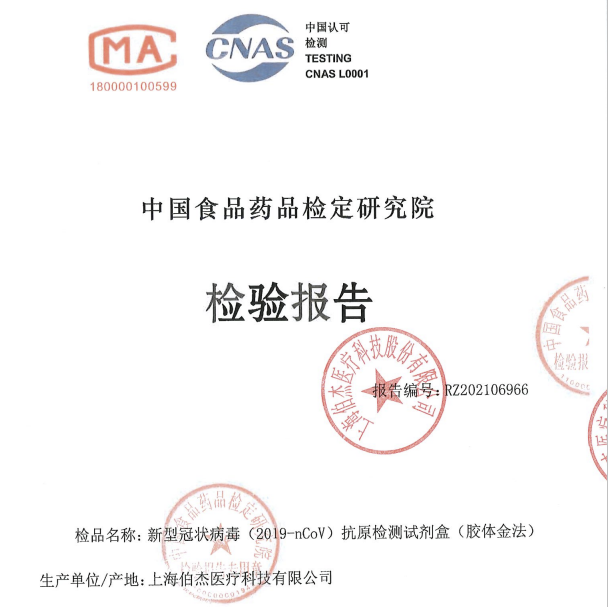伯杰新型冠狀病毒抗原檢測試劑盒(膠體金法)部分注冊檢報告