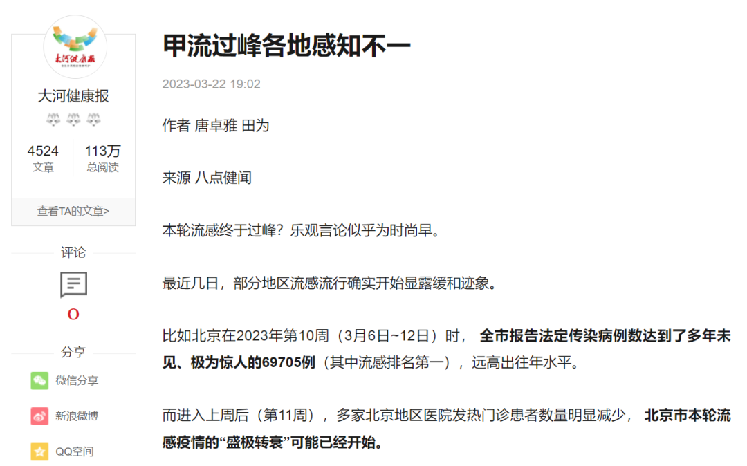 來源于2023年3月22日大河健康報《甲流過峰各地感知不一》
