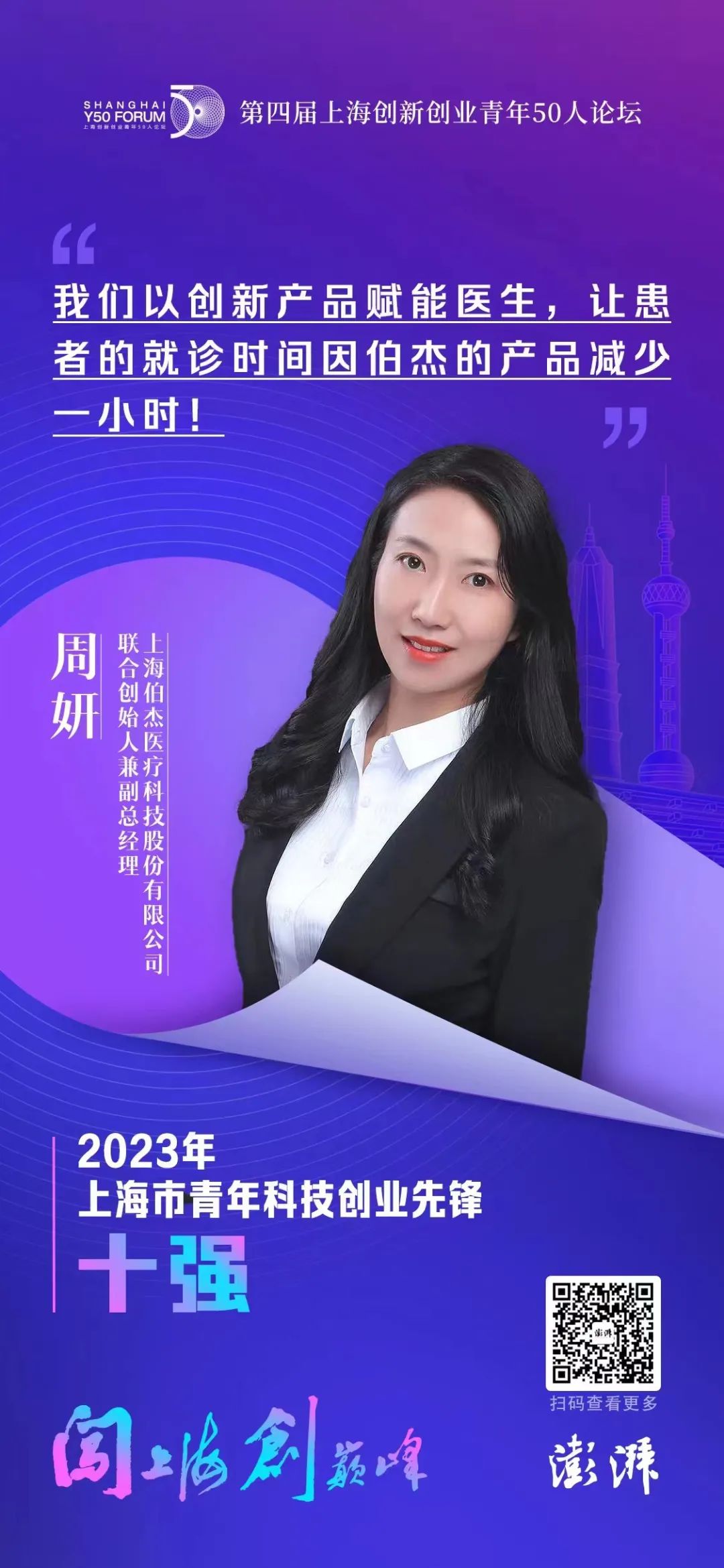 論壇現(xiàn)場發(fā)布了分布于生物醫(yī)藥、人工智能、信息技術(shù)等多個領(lǐng)域的2023年“上海青年科技創(chuàng)業(yè)十大先鋒”, 作為生物醫(yī)藥領(lǐng)域代表,上海伯杰醫(yī)療科技股份有限公司聯(lián)合創(chuàng)始人兼副總經(jīng)理周妍入選。