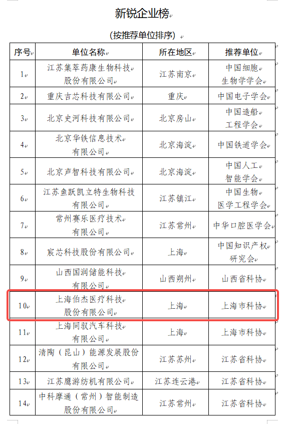 經(jīng)征集、初評、終評,中國科學(xué)技術(shù)協(xié)會(以下稱“中國科協(xié)”)于近日公示了2023年“科創(chuàng)中國”系列榜單遴選結(jié)果,共計(jì)230項(xiàng)擬入榜項(xiàng)目:先導(dǎo)技術(shù)榜150項(xiàng)、新銳企業(yè)榜50項(xiàng)、融通創(chuàng)新組織榜10項(xiàng)、技術(shù)經(jīng)理人先鋒榜20項(xiàng),公示期為6月17日-6月21日。伯杰醫(yī)療榮登“新銳企業(yè)榜”。