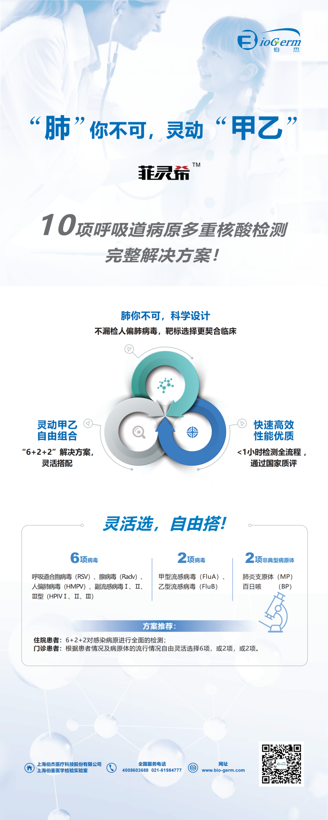 伯杰醫(yī)療呼吸道六項病毒核酸檢測試劑基于成熟的實時熒光PCR技術(shù),檢測靶標可覆蓋高流行的呼吸道常見病原:腺病毒、呼吸道合胞病毒、副流感病毒Ⅰ型、副流感病毒Ⅱ型、副流感病毒Ⅲ型、人偏肺病毒,50min快速出報告。完美契合國內(nèi)外《共識》及檢測方案的最新要求。