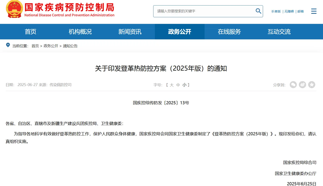 近日,國(guó)家疾病預(yù)防控制局與國(guó)家衛(wèi)生健康委員會(huì)聯(lián)合印發(fā)《登革熱防控方案(2025年版)》,明確了病例報(bào)告管理、疫情處置、實(shí)驗(yàn)室檢測(cè)和預(yù)防措施等具體要求,旨在為各地登革熱防控工作提供系統(tǒng)性指導(dǎo),以科學(xué)應(yīng)對(duì)登革熱疫情風(fēng)險(xiǎn),保障人民群眾生命健康。下面讓我們一起來(lái)了解下登革熱新方案的重點(diǎn)內(nèi)容吧~