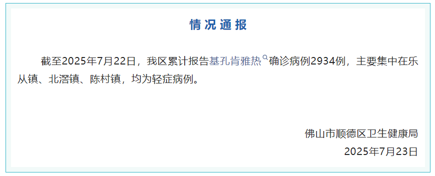 7月23日,佛山市順德區(qū)衛(wèi)生健康局通報(bào),截至2025年7月22日,順德區(qū)累計(jì)報(bào)告基孔肯雅熱確診病例2934例,主要集中在樂從鎮(zhèn)、北滘鎮(zhèn)、陳村鎮(zhèn),均為輕癥病例。加上其他區(qū)通報(bào)的確診病例,佛山當(dāng)前基孔肯雅熱確診病例已超過3000例!