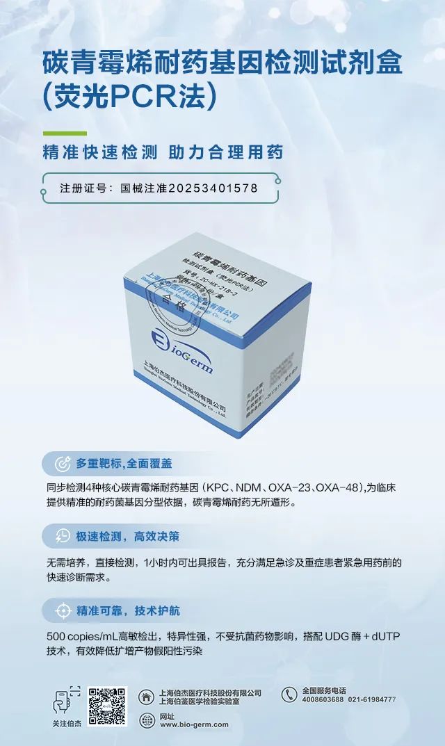 上海伯杰醫(yī)療新推出的碳青霉烯耐藥基因檢測試劑盒,以 500copies/mL 的高靈敏度,可快速識別 KPC、NDM、OXA-23、OXA-48耐藥,通過內源性內標設計有效規(guī)避假陰性,精準捕獲更低濃度的耐藥基因,為早期感染識別奠定基礎,顯著提升診斷的準確性與可靠性。該技術實現無需培養(yǎng),直接檢測,1小時內可出具報告,充分滿足急診及重癥患者緊急用藥前的快速診斷需求。讓患者在黃金救治期避免盲目用藥,并及時觸發(fā)隔離防控措施,提升救治成功率,減少醫(yī)療資源浪費,為公共衛(wèi)生防控提供數據支撐。