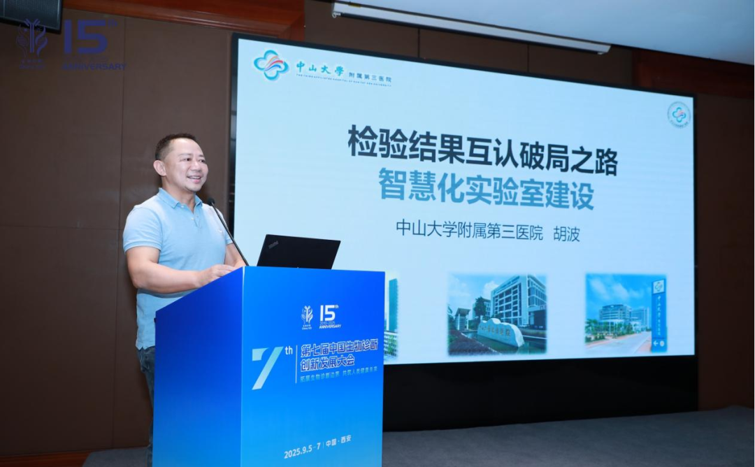接下來的演講者是中山大學附屬第三醫(yī)院檢驗科胡波教授,胡教授在感染性疾病、肝臟疾病及腫瘤診斷方向有很深造詣,胡教授以《檢驗結果互認破局之路——智慧化實驗室建設》為題,面對“不同醫(yī)院、不同儀器的結果要互認,標準、數據、質量三座大山怎么搬”展開介紹。胡教授指出,檢驗結果互認面臨“標準不統(tǒng)一、數據孤島、質量參差”等核心堵點,樣本溯源因此至關重要。而通過AI算法校準檢測偏差、搭建跨機構質控云平臺,實現試劑、設備、流程的數字化標準統(tǒng)一,再輔以合理的質量管理體系、基于患者數據的實時質控及智能化升級以減少誤差,正是破解這一難題的基石,其在疾病篩查預警中亦發(fā)揮關鍵作用。