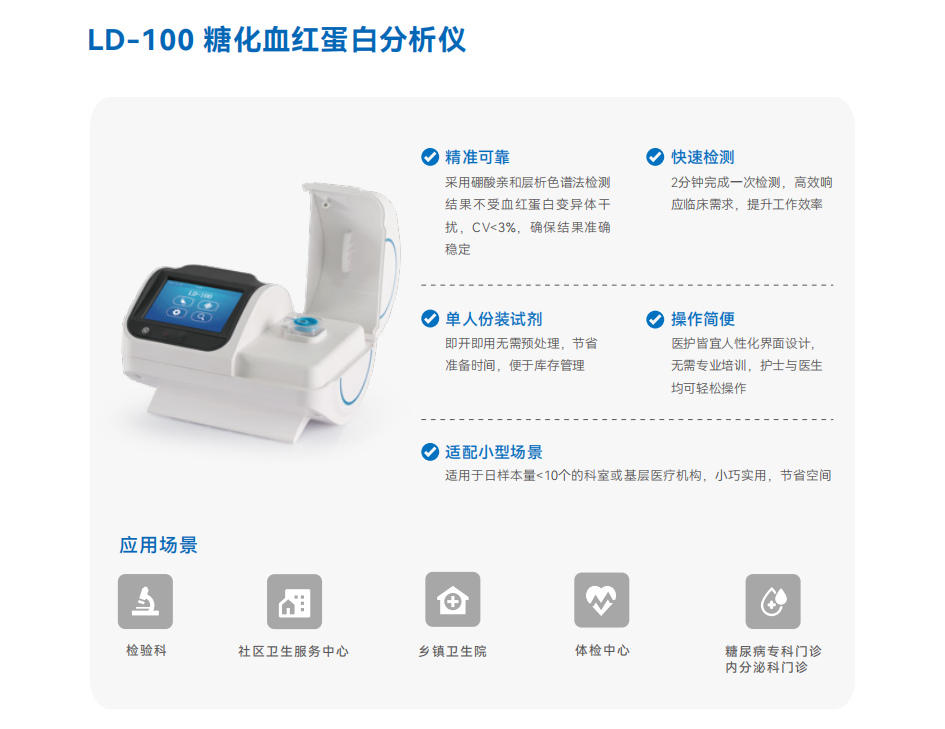 伯杰醫(yī)療全資子公司雷諾華科技推出的LD-100糖化血紅蛋白分析儀,憑借精準(zhǔn)可靠、快速便捷、基層友好的產(chǎn)品特性,成為完美契合國(guó)家慢病管理政策的落地需求。該設(shè)備不僅是基層醫(yī)療機(jī)構(gòu)的檢測(cè)工具,更是推動(dòng)糖尿病防治關(guān)口前移、實(shí)現(xiàn)"健康中國(guó)2030"戰(zhàn)略目標(biāo)的重要技術(shù)支撐。