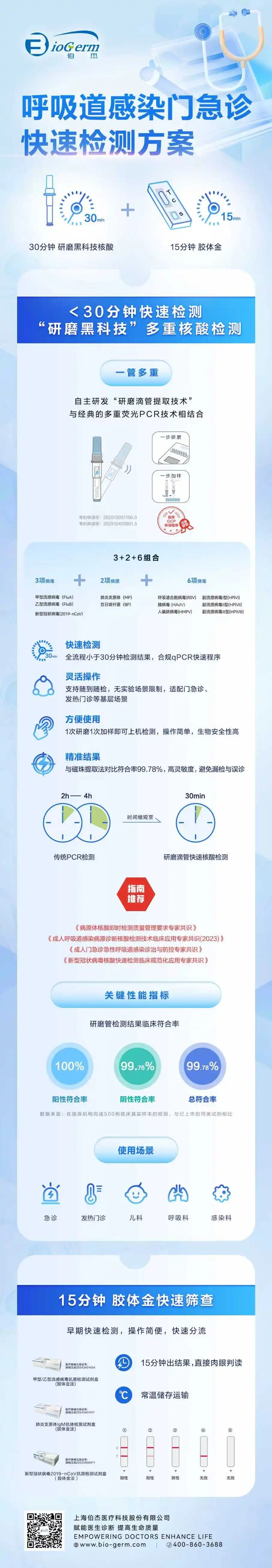 伯杰醫(yī)療門急診核酸快速檢測(cè)方案,采用先進(jìn)的熒光定量PCR技術(shù),具有靈敏度高、特異性強(qiáng)、操作簡(jiǎn)便等優(yōu)點(diǎn)。可提供甲乙流、肺支、百日咳;以及呼吸道常見病毒的呼吸道病毒六項(xiàng)檢測(cè)試劑盒,在檢測(cè)偏肺病毒、合胞病毒同時(shí)包含腺病毒(HAdV)、副流感病毒(PIVⅠ、Ⅱ、Ⅲ型),覆蓋CDC監(jiān)測(cè)的重要致病原。搭配近期新推出的研磨管黑科技,30分鐘出結(jié)果,助力門急診快速早篩方案,有研究顯示:使用快速多重PCR精準(zhǔn)診斷可減少住院時(shí)間0.82天?此外,另有甲型/乙型流感病毒抗原檢測(cè)試劑盒(膠體金法)操作簡(jiǎn)便快捷,僅需1分鐘即可完成檢測(cè),15分鐘內(nèi)提供結(jié)果。成為門、急診病原體篩查的得力助手,幫助醫(yī)療機(jī)構(gòu)更高效地分流患者,顯著提升整體診療效率與服務(wù)質(zhì)量。