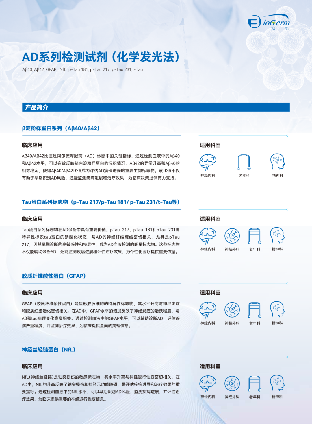 上海伯杰醫(yī)療科技股份有限公司的AD系列檢測試劑,也引起了參會(huì)專家學(xué)者的高度關(guān)注。伯杰醫(yī)療AD系列檢測試劑依托高靈敏度化學(xué)發(fā)光技術(shù),檢測靈敏度可到達(dá)百fg級(jí)別,可精準(zhǔn)捕獲外周血中AD特異性生物標(biāo)志物,包括Aβ42/40,pTau217,pTau181,GFAP,NfL等指標(biāo),可幫助臨床醫(yī)生基于“A+T+N”診斷框架進(jìn)行疾病診斷,實(shí)現(xiàn) “一滴血” 對(duì)病患進(jìn)行早期篩查,病癥分型,干預(yù)效果監(jiān)測等不同臨床用途需要。與會(huì)專家對(duì)此基于肯定,并給予進(jìn)一步合作交流的期望。
