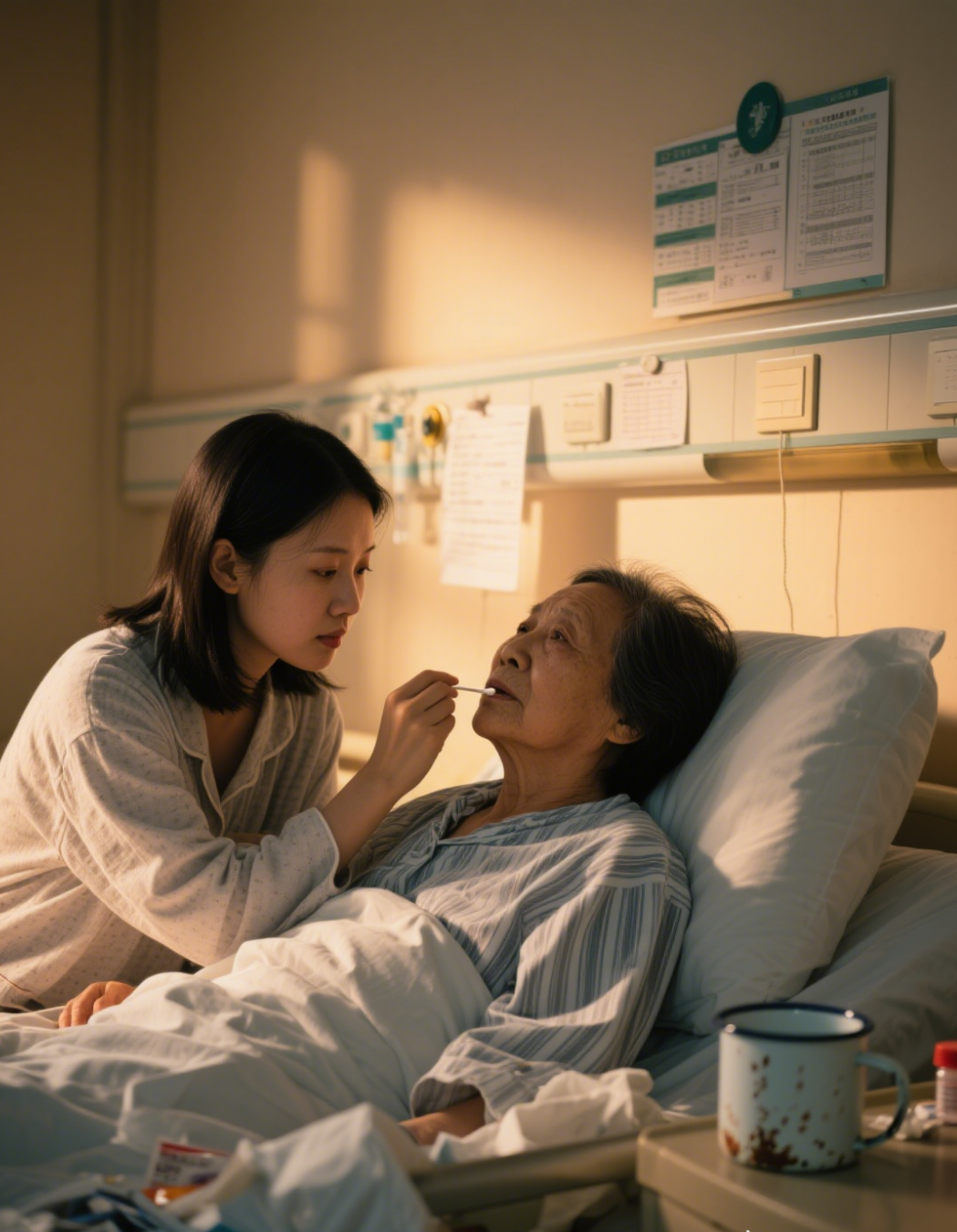 棉簽蘸著溫水,輕輕擦去媽媽嘴角殘留的藥末。手上搪瓷藥杯早已斑駁,就像她此刻渾濁的眼神 —— 明明望著我,卻像隔了層厚霧,認(rèn)不出眼前人。