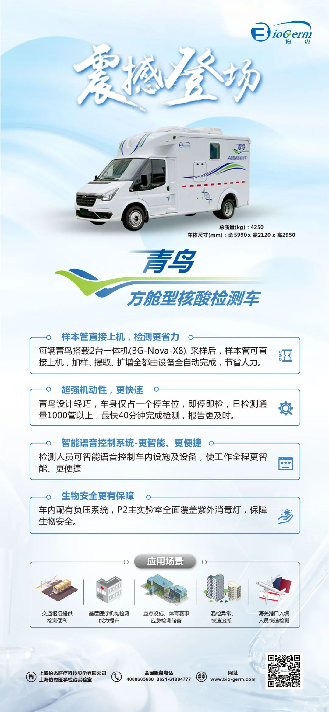 針對目前的市場需求,更好的助力疫情防控,提速核酸檢測時間,伯杰醫(yī)療從實際應(yīng)用場景出發(fā),研發(fā)推出了青鳥方艙型移動核酸檢測車,其僅占用1個普通車位,卻能實現(xiàn)大型核酸檢測車的日檢千管標(biāo)準,同時搭載其自主研發(fā)集全自動加樣、核酸提取、擴增檢測、結(jié)果分析于一體的恒溫核酸擴增檢測分析儀BG-Nova-X8(查看最新產(chǎn)品介紹),將原來需要3-6小時才能完成的新冠常規(guī)核酸檢測提速至40min!