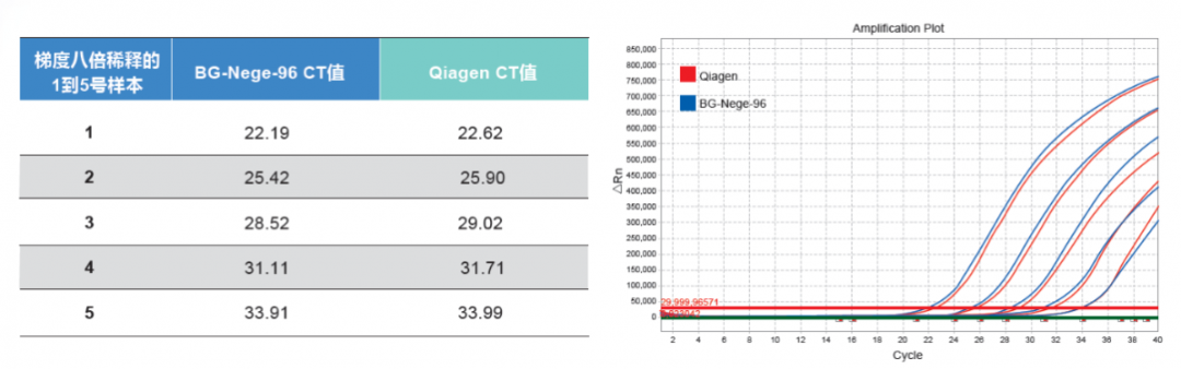 將原始樣本稀釋成CT22左右,8倍梯度稀釋,稀釋四個梯度。分別用BG-Nege-96核酸提取儀和QIAamp Viral RNA Mini Kit提取,qPCR檢測,復孔后對CT值進行比對。BG-Nege-96核酸提取儀的提取純度與金標準等效甚至更優(yōu)。