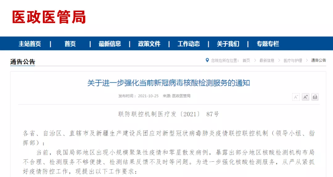 10月25日,國(guó)家衛(wèi)健委醫(yī)政醫(yī)管局發(fā)布了《關(guān)于進(jìn)一步強(qiáng)化當(dāng)前新冠病毒核酸檢測(cè)服務(wù)的通知》,明確核酸檢測(cè)機(jī)構(gòu)要向社會(huì)提供24小時(shí)核酸檢測(cè)服務(wù),要力爭(zhēng)在6小時(shí)之內(nèi)報(bào)告結(jié)果等。