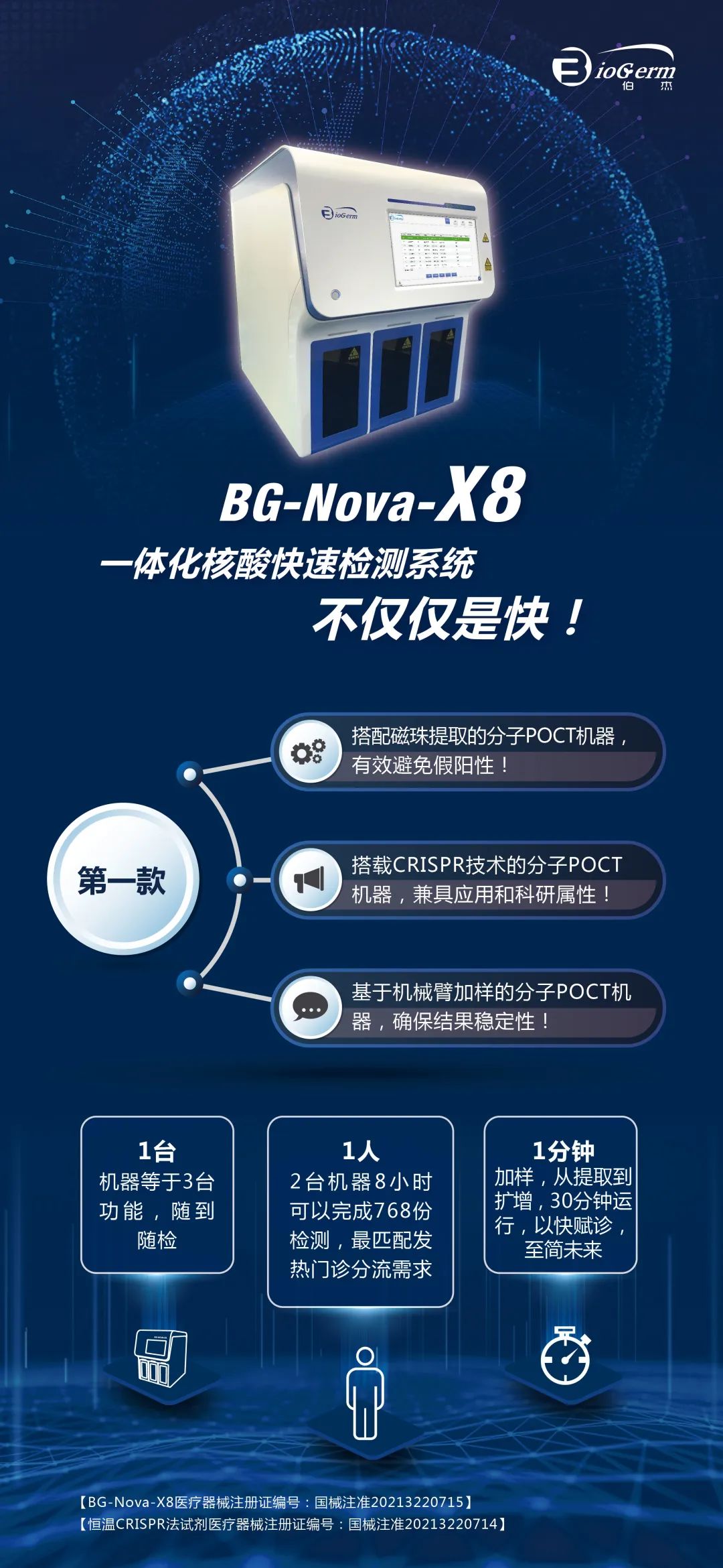“BG-Nova-X8,不僅僅是快!”在POCT一體機(jī)上率先采用經(jīng)典磁珠核酸提取技術(shù),讓結(jié)果更加準(zhǔn)確;首款國(guó)內(nèi)上市的搭載CRISPR技術(shù)的一體機(jī),兼具科研與應(yīng)用屬性;集成的高精度機(jī)械臂讓分子檢測(cè)全程得以標(biāo)準(zhǔn)化,保證了結(jié)果的可靠性。