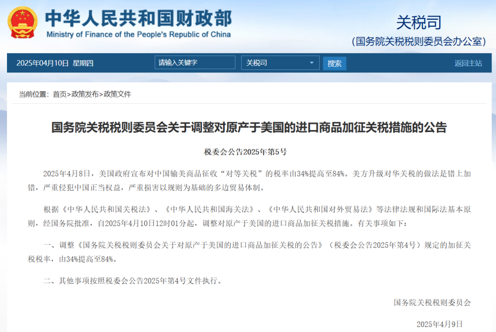 國務(wù)院關(guān)稅稅則委員會(huì)9日發(fā)布公告,經(jīng)國務(wù)院批準(zhǔn),自2025年4月10日12時(shí)01分起,調(diào)整《國務(wù)院關(guān)稅稅則委員會(huì)關(guān)于對(duì)原產(chǎn)于美國的進(jìn)口商品加征關(guān)稅的公告》(稅委會(huì)公告2025年第4號(hào))規(guī)定的加征關(guān)稅稅率,由34%提高至84%。