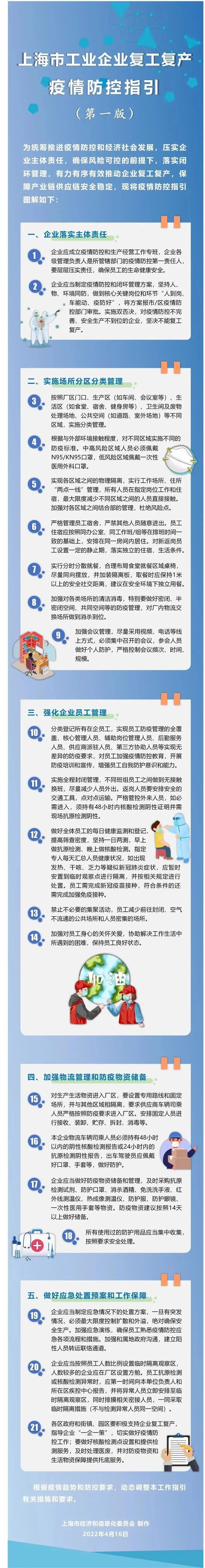 上述指引包括企業(yè)落實主體責(zé)任、實施場所分區(qū)分類管理、強化企業(yè)員工管理、加強物流管理和防疫物資儲備、做好應(yīng)急處置預(yù)案和工作保障五大方面。