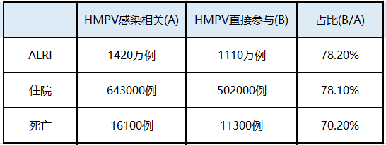 由于HMPV病毒的高發(fā)性,2021年柳葉刀全球健康雜志再次著重描述了HMPV的流行病學7:僅2018年一整年,全球5歲以下幼兒中發(fā)生了1420萬例HMPV相關感染導致的急性下呼吸道感染(表1)。每例患兒的總住院花費中位數超過了5000美元,有慢性病的患兒花費明顯更高8。另外,我們也應注意到,HMPV導致的住院患者中有58%是1歲以內嬰兒,HMPV導致死亡的病例中有64%是6個月以內嬰兒。