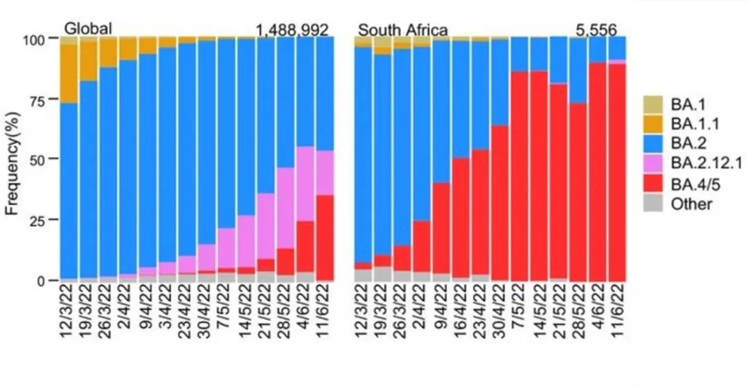圖2:BA.1, BA.1.1, BA.2, BA.2.12.1以及BA.4和BA.5在 GISAID 中的頻率。(左全球,右南非)