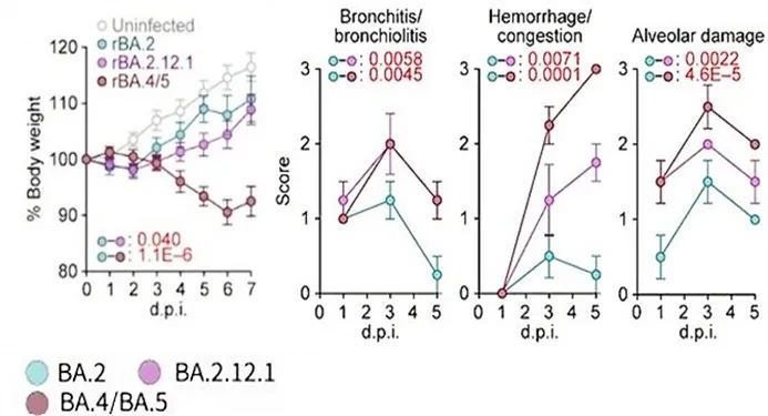 圖4:BA.2,BA.2.12.1以及BA.4和BA.5對倉鼠肺部以及體重的影響