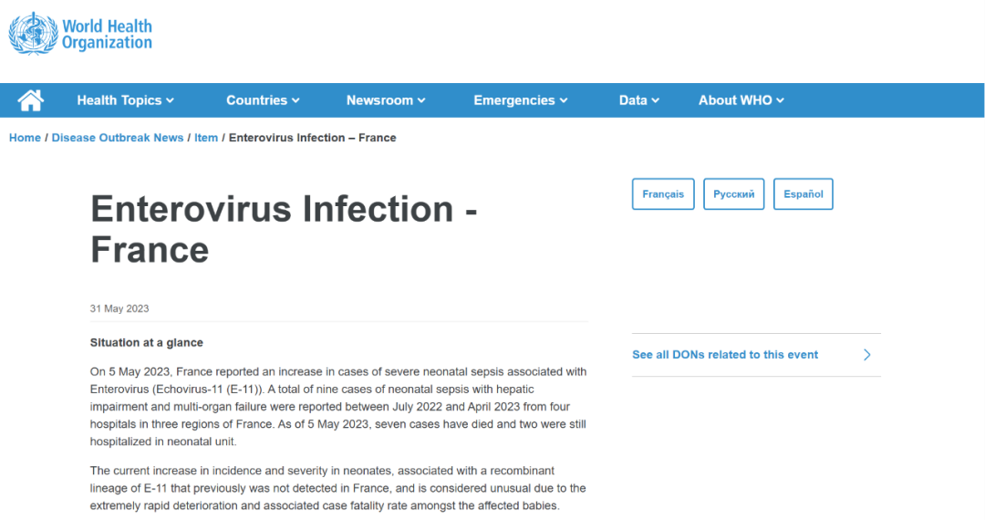 對(duì)所有9例病例(包括血液樣本、咽拭子、鼻咽拭子、腦脊液樣本和/或尸檢活檢)進(jìn)行的腸道病毒逆轉(zhuǎn)錄聚合酶鏈?zhǔn)椒磻?yīng)(RT-PCR)檢測(cè)結(jié)果陽(yáng)性,分型為??刹《?11(E-11)。通過RT-PCR和腸道病毒基因分型分析,五位母親中有四位,確診??刹《?11感染。所有接受檢測(cè)的母親在分娩前或分娩時(shí)的三天內(nèi)都出現(xiàn)了胃腸道癥狀或發(fā)燒。