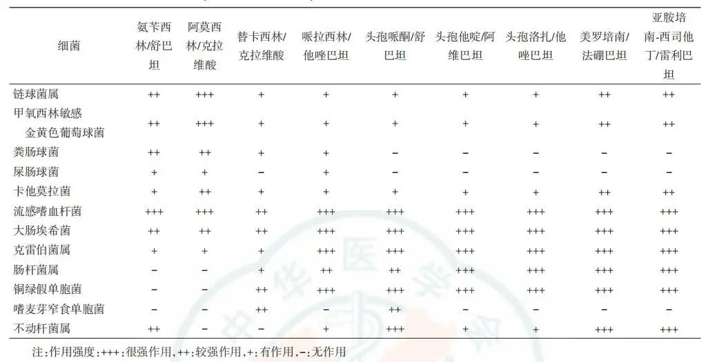 表1β-內(nèi)酰胺類抗生素/β-內(nèi)酰胺酶抑制劑復(fù)方制劑抗菌作用[5]