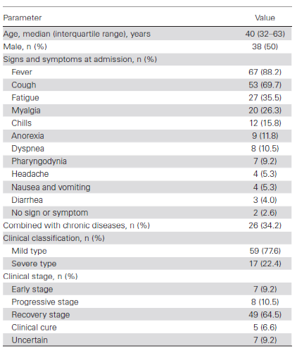 數(shù)據(jù)分析:通過RT-PCR和ddPCR兩種方法的檢測,34例篩查病例和17例可疑病例的77份標(biāo)本結(jié)果均呈陰性。從患者年齡上看,中位年齡為40歲,男性比例為50%;入院時最常見的體征和癥狀是發(fā)燒和咳嗽。