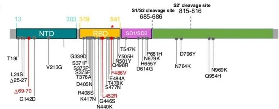 BA.4和BA.5是Omicron進化枝的兩個亞型。相比去年末在大多數(shù)國家引發(fā)大面積感染的BA.1,這兩個亞型更像BA.2。BA.4和BA.5共享了Omicron BA.2相同的突變位點,在此基礎(chǔ)上又同時具有不同的新突變位點。相對于BA.2,BA.4和BA.5有額外的刺突突變Del69-70、L452R、F486V和R493Q[4]。